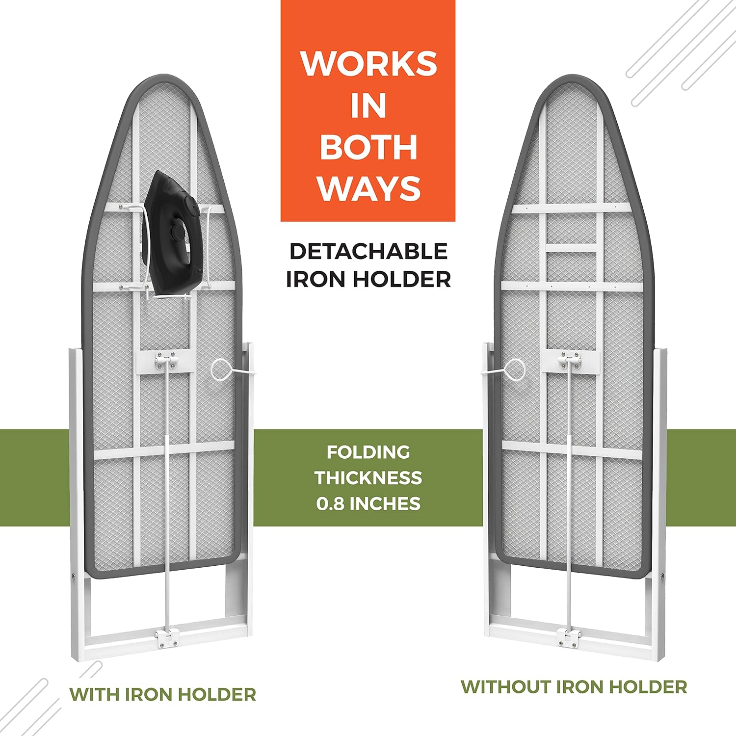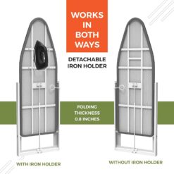 - OPTIMAL SIZE / PULL OUT DESIGN : BOARD SIZE: 36.2″ X 12.2″ . The space saving iron table has a retractable design with a easy lock mechanism that will help you stowaway the iron center flush with your wall, or behind the door thus clearing space and looking aesthetically great.