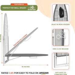 - OPTIMAL SIZE / PULL OUT DESIGN : BOARD SIZE: 36.2″ X 12.2″ . The space saving iron table has a retractable design with a easy lock mechanism that will help you stowaway the iron center flush with your wall, or behind the door thus clearing space and looking aesthetically great.