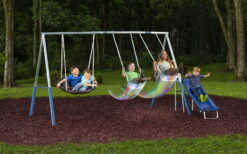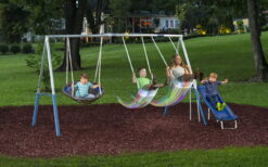 XDP Recreation, one of the most popular brands in the market, introduces our NEW Cool and Exciting FIREFLY™ LED Swing Set, which includes two swing seats with 24 self-enclosed Flashing/strobing lights that have over 7 modes of operation and light effects. This swing set is part of our NEW G-series™ Galvanized steel tubing swing sets. 2-inch, thick Galvanized steel tubing for durability. The Set includes 2 Firefly™ LED Swing Seats with vinyl-covered adjustable height chains for safety, a Super Disc™ Swing for 2 kids, and a 5′ blow-molded Wave Slide with a safe landing zone. Up to 5 children can play at once on the swing set. Your children will have hours of fun day or night! Safety is important to us; all our products meet or exceed ASTM safety standards.