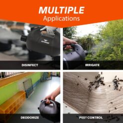 - Cordless and easy to operate, turn on the power switch to start the fogging work, the fogger is equipped with an electric water pump powered by Lithium-Ion battery for easy set up and use