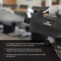 XPOWER’s F-8B ULV (ultra-low volume) cold fogger offers you ultimate performance in a small package. Featuring a lightweight and compact design, this unit is ideal for full coverage for office, restaurants/food services, schools, hospitals, senior centers, pet boarding, greenhouse, commercial properties, and more. Rechargeable battery can get a full charge within 3-hours and up to 16-minutes of continuous run time. With the convenience of cordless operation and 600 ml (20.2 fl oz.) reservoir, the F-8B fogging machine will handle all your project/jobsite with ease. The F-8B features a 1 speed, 280 watt motor, and an adjustable nozzle producing average droplet size of less than 50 micron. The easy fill reservoir incorporates a tight cap and a reservoir level window to monitor your liquid levels. Applying disinfectants, sanitizers, and other solutions have never been easier than using the XPOWER line of ULV cold foggers. With its extended spray distance and ultra-small droplet size, this compact versatile unit is the industry leading choice for all your fogging needs.