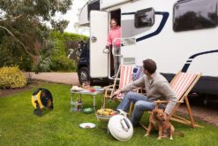 Powerful rechargeable battery with charging cables for both AC outlets and car charging ports.
