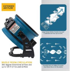 With an advanced AC/DC dual power motor, you can operate the XPOWER FC-150B air circulator utility fan whether it’s running on battery or plugged in and charging. No more tripping over power cables or plugging and unplugging as you move around, and no more suffering in the heat while you wait for it to charge.The FC-150B provides high-velocity focused and extended airflow up to 120 feet in any direction, all due to its high-torque AC/DC dual power motor, unique spiral grill, and exclusive fan blade technology. Aim it up to efficiently circulate rising warm air and reduce heating costs, or straight down or at a wall to create a cooling effect. It’s perfect for drying floors, even when an outlet isn’t nearby.The FC-150B air circulator utility dryer provides up to 1000 CFM rated airflow and only draws a maximum of 0.6 Amps from an AC outlet, and is equipped with a 18200mAh rechargeable battery. Battery run times vary but are estimated at 3 hours at full speed and 24+ hours at low speed. An LED battery-life indicator shows when you need to recharge, and you can simply plug the cord into an AC outlet when you do. With variable speed control and 360° frame rotation, you have full control over the power and direction of your airflow, and it even has a 3-hour timer.Don’t settle for less when you can have the best. XPOWER’s rechargeable FC-150B air circulator utility fan will take you to new levels of comfort and convenience.