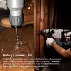 - Rotary hammer drill – perfect for tough tasks such as demolishing brickwork, removing plaster, taking off tiles and digging out old grouting, the drill is powered by an impressive motor, making it suitable for drilling into materials including masonry, wood and metal