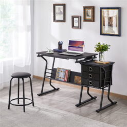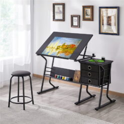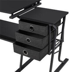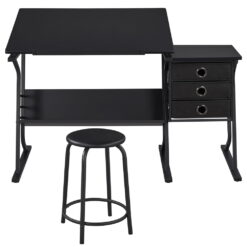 Yaheetech 3 Drawers Drafting Table & Stool Set For Artists Tilting Tabletop with Additional Side Countertop, Black