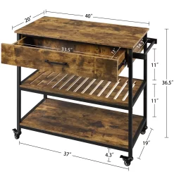 Crafted from MDF and metal, the whole stand is sturdy enough. Covered with a water-resistant surface, this 3-tier countertops is easy to clean, its base features a wide drawer and two shelves that offer a decent space for all the essentials. The spacious 40″ x20″ countertop gives you extra elbow room as you prepare meals and dine. After your arrangement, the countertop might look warm and elegant. This kitchen cart conveniently features four wheels (two with brakes) below offer smooth rolling and moving