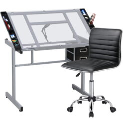 Yaheetech Adjustable Glass Drafting Drawing Table w/Storage Drawers + PU Leather Low Back Armless Chair, Black