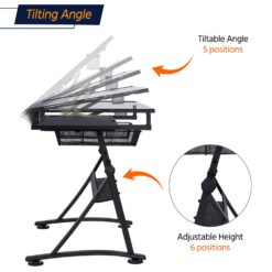 - 0-40 degrees tilting angle: The 90cm/35.4” long, 60cm/23.6” wide tabletop can be tilted up to 40 degrees from the horizontal and locked at 5 heights for the best view for the work in progress