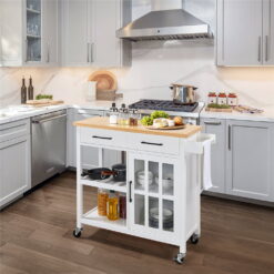 Yaheetech Mobile Kitchen Island Kitchen Cart with Bamboo Top and Storage & Tempered Glass Cabinet Door, White
