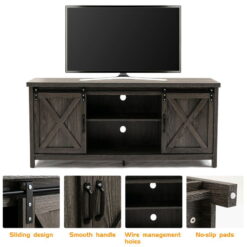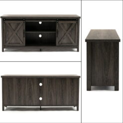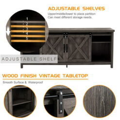 This yapping modern rectangular TV console is made of a solid panel with a rustic gray finish and can accommodate most flat-screen TVs under 65 inches. The 2 rustic barn doors on the sliding hardware can close 4 of the 6 shelves at any time. It is an ideal complement to your bedroom and living room, adding a sense of fashion and functionality. The key console has 3 shelf cabinets with partitions and a backing that can be accessed by wires, providing perfect and sufficient space to store and display your cable TV boxes, entertainment consoles, books, etc.