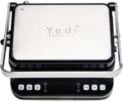 - YEDI TOTAL PACKAGE 6-in-1 GRILL: The Yedi grill works as a contact grill, waffle maker, panini press, full grill, full griddle, half grill/half griddle with temperature ranges from 175-450 degrees Fahrenheit.