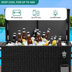 - LARGE CAPACITY- 80 qt wicker cooler can hold up to 100+ cans or 55+ bottles; Two-sided easy access lid expands the storage area, while the included stainless steel cutting board helps support your needs.