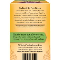 Embark on a journey to vitality with a cup of Yogi Green Tea Pure Green tea. Recommended for thousands of years by Chinese physicians as a natural path to vitality and longevity, Green Teas’ natural antioxidant properties help to support overall health. Yogi Green Tea Pure Green tea combines carefully selected, high-quality Organic Green Tea leaves for a robust, flavorful blend with an elegant aroma.