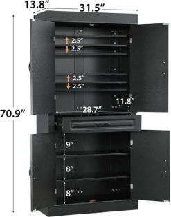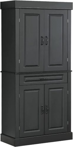 Clean lines and antique handles will bring elegance and glamour to your home decor. Classic and functional, it can be the functional heart of your home space, no matter where it is in any kitchen, dining room, bedroom, bathroom or hallway. Made from 0.6″ thick premium MDF, this pantry is sturdy, stable and durable enough to provide long-term storage for your items. The upgraded premium metal hinge offers high performance in terms of resistance and flexibility. In addition, the anti-tipping straps can help you fix the cabinet to the wall to avoid tipping and shaking, making it more secure and reliable.The upper cabinet of this locker has 2 adjustable shelves for a variety of storage options. Each shelf can be adjusted in three positions to suit your storage needs of different sizes. You can also remove the shelves for more space. Equipped with one large drawer and two double-door cabinets, this practical storage cabinet can store lots of things such as silverware, towels, cutlery, small appliances and bottles, providing the perfect storage space for everyday clutter. In addition, the front door features a magnetic buckle that keeps the door closed and prevents items from falling.