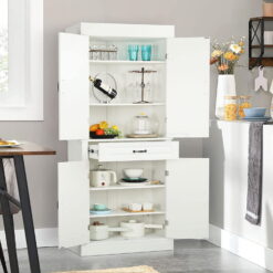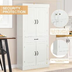 Clean lines and antique handles will bring elegance and glamour to your home decor. Classic and functional, it can be the functional heart of your home space, no matter where it is in any kitchen, dining room, bedroom, bathroom or hallway. Made from 0.6″ thick premium MDF, this pantry is sturdy, stable and durable enough to provide long-term storage for your items. The upgraded premium metal hinge offers high performance in terms of resistance and flexibility. In addition, the anti-tipping straps can help you fix the cabinet to the wall to avoid tipping and shaking, making it more secure and reliable.The upper cabinet of this locker has 2 adjustable shelves for a variety of storage options. Each shelf can be adjusted in three positions to suit your storage needs of different sizes. You can also remove the shelves for more space. Equipped with one large drawer and two double-door cabinets, this practical storage cabinet can store lots of things such as silverware, towels, cutlery, small appliances and bottles, providing the perfect storage space for everyday clutter. In addition, the front door features a magnetic buckle that keeps the door closed and prevents items from falling.