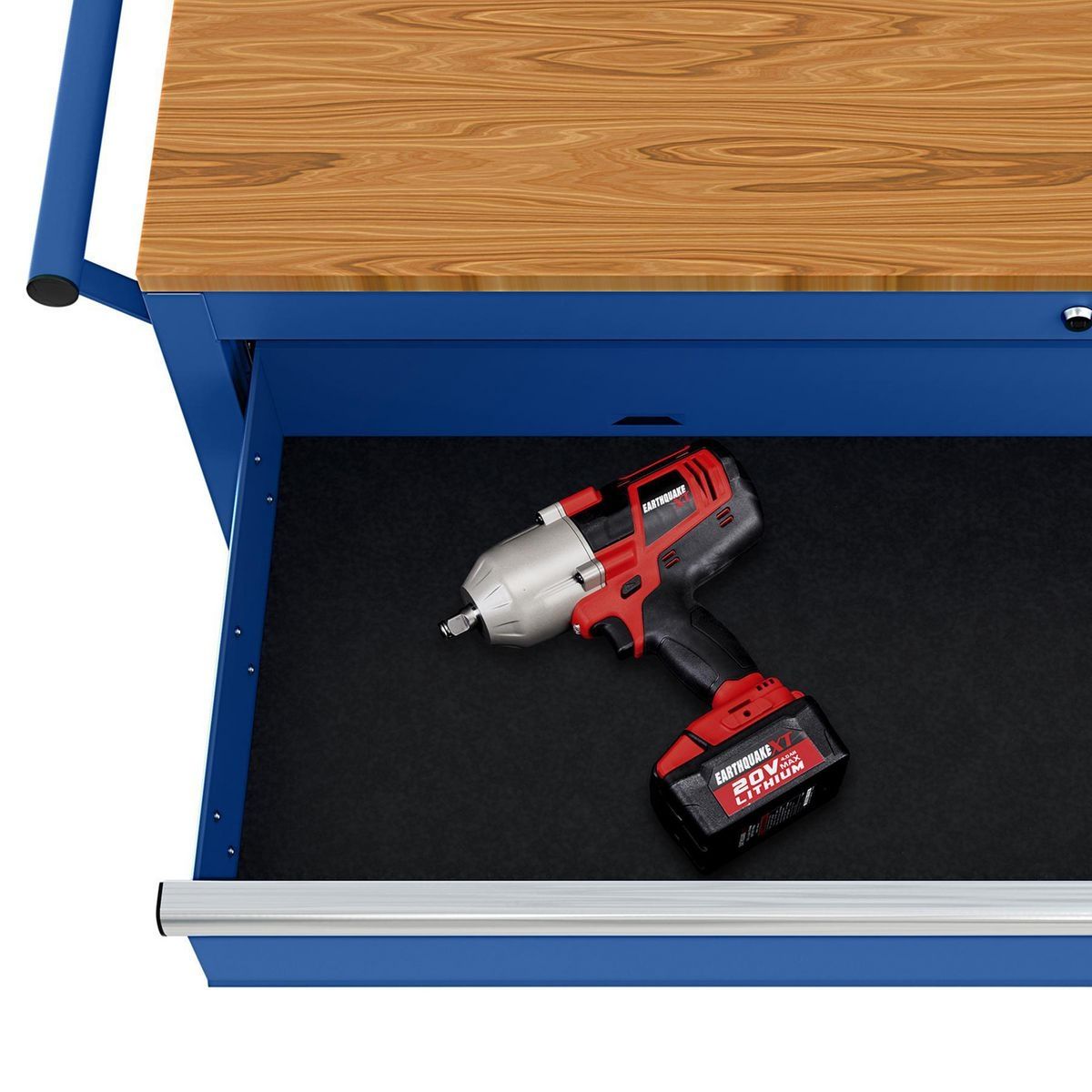 This YUKON® 46 in. Mobile Workbench has a two-door cabinet for bulk storage. Made with heavy gauge steel, heavy duty drawer slides and a high load capacity, the mobile workstation has a solid wood top with a large surface area. The large capacity drawer has ball-bearing slides for smooth action. The bulk storage cabinet has plenty of space for large tools and supplies.