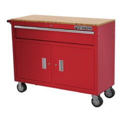 This YUKON® 46 in. Mobile Workbench has a two-door cabinet for bulk storage. Made with heavy gauge steel, heavy duty drawer slides and a high load capacity, the mobile workstation has a solid wood top with a large surface area. The large capacity drawer has ball-bearing slides for smooth action. The bulk storage cabinet has plenty of space for large tools and supplies.