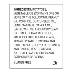Potatoes cooked in peanut oil or a blend of peanut oil and canola, corn, safflower or sunflower oil, sugar, salt, dextrose, smoked malt, torula yeast, tomato powder, paprika and other spices, dehydrated onion and garlic, maltodextrin, monosodium glutamate, citric acid, natural flavor and extractive of paprika. CONTAINS WHEAT INGREDIENTS.