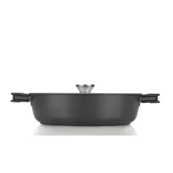 The Noir Sauté Pans offer a high-quality, cast aluminum piece complete with a Whitford Fusion Ti ceramic interior coating. Their strong side handles feature silicone grips that can be easily removed and replaced with one of 6 color options – red, butternut orange, mint green, sky blue, royal blue, and purple. The lids are flat for convenient storage and made of tempered glass for durability. The Noir Cooking Pan are also compatible with all domestic stoves including induction.Perfect for: Searing meats, saucy dishes, frying, braising, and more. The Noir Sauté Pans come with a Whitford Fusion Ti interior coating that provides a smooth and non-stick cooking surface. But smooth doesn’t always mean soft; the Whitford Fusion Ti is made with titanium-based particles to provide fantastic durability and resistance to abrasion. This ceramic coating is in compliance with food contact regulations, guaranteed to provide a healthful cooking surface, and is BPA, PTFE, and PFOA Free. The Noir Cooking Pan offer a lightweight cast aluminum alternative with superior heat distribution for better cooking. Cast aluminum is one of the best conductors of heat you can find and at a fraction of the weight of other cookware alternatives. It is also longer lasting and lower maintenance, ensuring longevity with ease.The Noir pieces not only perform in the kitchen, they also adorn on the dining table. They come with removable silicone grips that can be replaced by one of 6 color options. Use the colors to match your kitchen, your cooking, the season, and more. They can also be used to identify allergy or diet-specific cookware for safer cooking.The Noir Sauté Pans offer convenience from start to finish. Compatible all domestic stoves, including induction, as well as oven safe up to 550 degrees Fahrenheit when the silicone grips are removed.