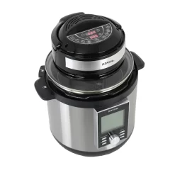 The Air Fryer Lid by Zavor turns any Zavor 6qt or 8qt pressure cooker or multi-cooker into an air fryer! It works as a traditional, toaster oven, roaster, convection oven and more, letting you make traditionally fried foods with a fraction of the fat and calories. Simply swap out the pressure cooker or multi-cooker lid for the Air Fryer Lid. That is perfect for all your favorite foods like buffalo wings, crispy shrimp, roasted veggies and even donuts! You can use it to add a nice crisp to your pressure-cooking recipes after cooking and to reheat your favorite leftovers. Eliminates the need for hot oil as it relies exclusively on hot air circulating around the food to achieve that crispy, fried feeling. The hot air circulates around the included frying basket to cook foods evenly, avoiding uncooked bottoms and overcooked tops. Foods prepared require little to no pre-heating time. Even when preparing frozen foods, traditional oven heating is not required. Compact and easy to store, making it ideal for any small or crowded kitchen. Fits pots with an inner diameter between 8.5″ to 9.75″. Dishwasher-safe accessories include: stainless steel frying basket, cooking tongs with silicone grips, and heat-resistant silicone mat.