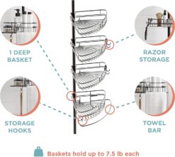 Say goodbye to fretting about a bottle of shampoo that might slip off your cluttered tub ledge and land on a toe to ruin your soothing shower. This Zenna Home Tension Pole Corner Shower Caddy will instantly solve your shower storage woes and worries. With four adjustable storage baskets (one is extra deep for tall items), plus hooks, a towel bar and built in razor holders, this pole caddy will help organize any shower. The caddy is easy to assemble (no tools, no drilling and no cutting needed), and it adjusts to fit in most bath and shower spaces (from 5 feet to 8 feet, 1 inch high). The rust-resistant shower caddy has an attractive bronze finish. To keep the caddy looking like new, simply wipe its parts clean with a damp cloth as needed. Sounds pretty nice, doesn’t it?