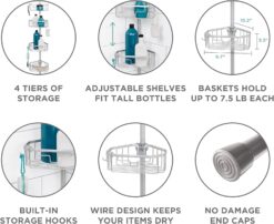- PROVIDES 4 TIERS OF VERSATILE SHOWER STORAGE: Includes 4 wire storage baskets (measuring 3.3 in. H x 9.7 in. W x 10.2 in. D) that easily adjust up and down caddy’s tension pole and are removable; baskets hold up to 7.5 lb. each