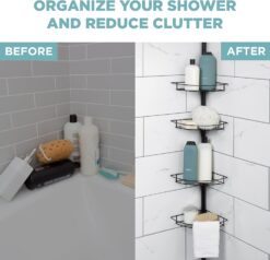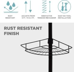 - ATTRACTIVE AND RUST-RESISTANT BUILD: Shower tension pole caddy has a stylish matte black finish that resists rust WITH 4 TIERS OF CONVENIENT IN-THE-SHOWER STORAGE: Features 4 wire storage baskets (measuring 1.5 in. H x 11.6 in. W x 8 in. D) that adjust to make room for taller bottles; baskets hold up to 7.5 lb. each