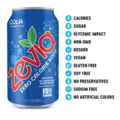- Zevia Zero Calorie Cola: Zevia Cola is a stevia sweetened diet soda that delivers all the things you like about traditional cola; Features notes of citrus and spice for a perfect combination of flavors