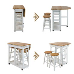 This is a foldable dining cart with two round bar stools. This dining cart is made of sturdy solid wood, which is environmentally friendly and safe. The tabletop can be expanded to extend the use space and can also be folded to reduce the occupied area, which is simple and convenient. There is a hand-pushing handle on the side of dining cart, which is convenient for pushing and pulling to various positions of house. The dining cart also has two drawers, which can accommodate some cutlery, chopsticks, spoons, etc. It is with two stable stools. When you need to use them, you can take them out directly from bottom of the dining cart and use as bar stools or dining stools. You can put them in directly to save space when they are not in use. If you want to have a simple and practical dining cart, this will be your best choice!