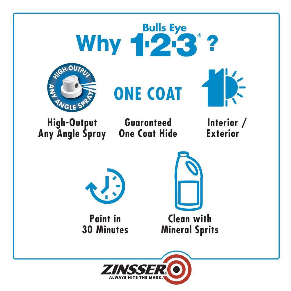 Zinsser 13 oz. Bulls Eye 1-2-3 White Oil Based Interior/Exterior Primer and Sealer Spray (Case of 6) provides excellent adhesion to glossy surfaces without sanding. It’s great for interior and exterior surfaces. Long lasting formula is designed to resist blistering, peeling, mold and mildew growth, inhibit rust and seal tanning bleed.