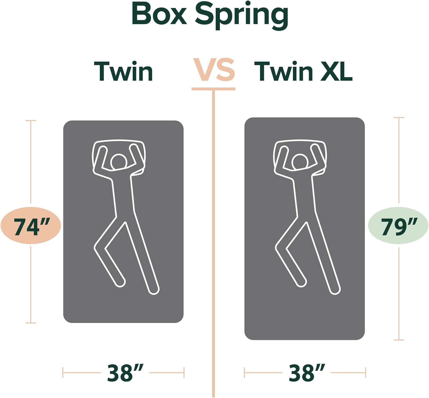 - TWIN DIMENSIONS – The dimensions of this standard twin size box spring are 74 x 38 x 9 inches. The length is 5 inches shorter than our Twin XL size. Please measure your bedframe to ensure compatibility.