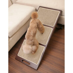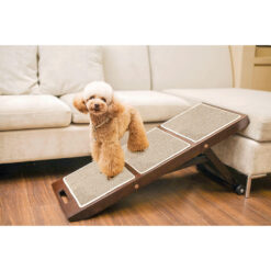 The Collapsible Pet Ramp is both convenient and versatile. It comes in three adjustable heights, giving your pet the assistance they need to get onto the couch or bed. The sturdy wooden frame comes with rubber soles for a better grip and wheels for easier transportation. The ramp folds flat for simple storage under a couch or bed.