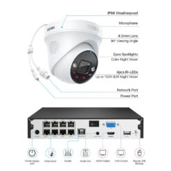 ZOSI 8SN-2258W4-20-US-A2 4K UHD 8-Channel 2TB PoE NVR Security Camera System with 4 8MP Wired Spotlight Cameras, Color Night Vision, 2-Way Audio