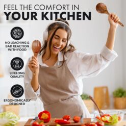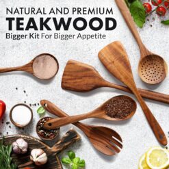 - SCRATCH-FREE DESIGN: Our Large Wooden Cooking Utensil Set is made of Premium Quality Teak Wood, a close-grained hardwood with high organic oil and silica content that is known for being one of the hardest, strongest, and most durable of all timbers. Beautifully crafted, soft to touch, lightweight, and very solid basically defines these Wooden Spoon Sets for Cooking. Now you can use your precious non-stick cookware without worrying about damages and scratches.