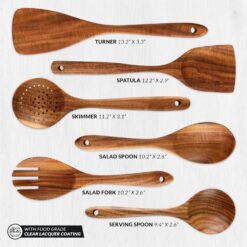 - TOP NOTCH CRAFTSMANSHIP: Our Kitchen Premium Large Wooden Utensils for Cooking are specially made, high-quality wooden utensils that serve all your cooking needs. Our Wooden Kitchen Utensil Set consists of 6 large utensils that include a salad spoon, salad fork, serving spoon, skimmer, spatula, and turner. These Wood Utensils Set bring a classic and elegant touch to your kitchen with the perfect assortment of practical, large sizes that are ergonomically shaped for ideal functionality.